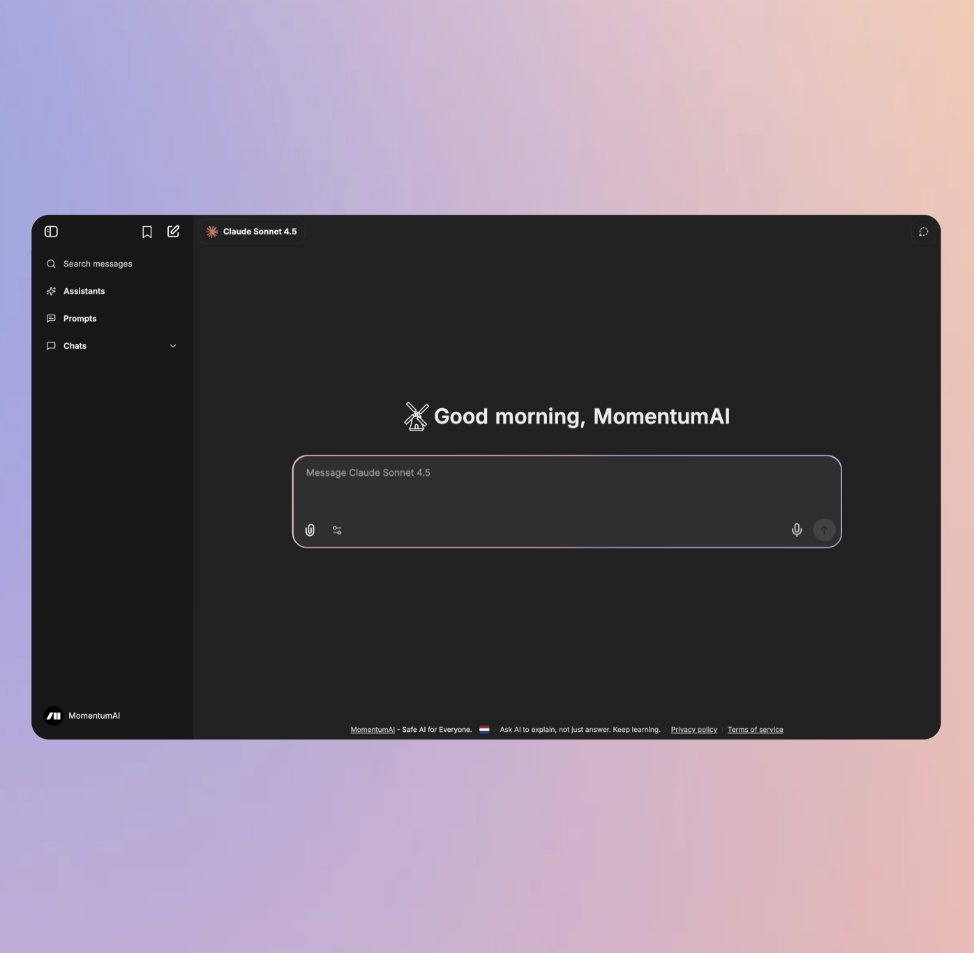 With MomentumAI, your entire organisation harnesses the power of AI through a single central platform. Your team chats, analyses, learns, and shares knowledge without fragmented tools. You maintain control, and your colleagues gain clarity and calm.