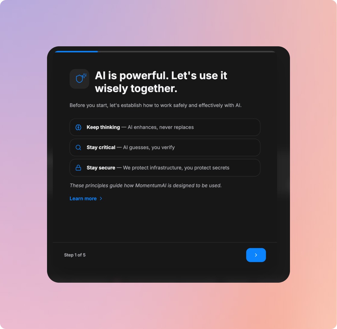 Get started confidently. Our learning environment provides your team with the tools, knowledge, and guidance to use AI safely and responsibly from day one.